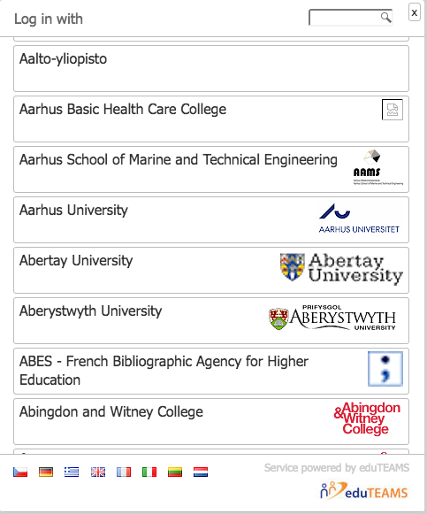 For a first time user a list of all possible IdPs to select from is presented. You may select your home organization from the list by clicking it. You are now directed to home organization IdP.